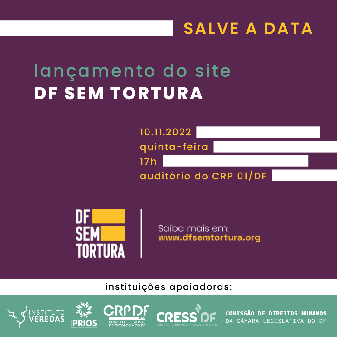 #DescreviParaVocê: além das informações acima, a imagem colorida conta com a marca gráfica do projeto DF Sem Tortura, bem como a marca das instituições apoiadoras: Instituto Veredas, PRIOS, CRP 01/DF, CRESS DF e Comissão de Direitos Humanos da CLDF.