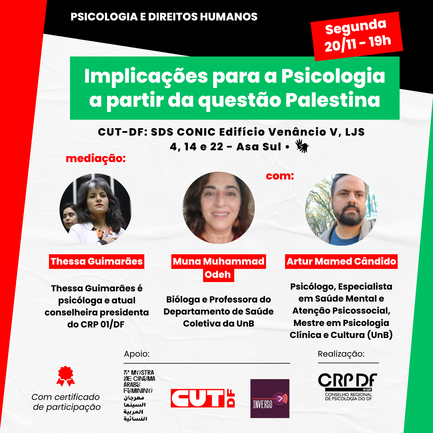 Participe do evento (presencial com transmissão on-line) Implicações para a Psicologia a partir da questão Palestina, realizado pelo CRP 01/DF, em parceria com a ONG Inverso - Centro de Convivência em Saúde Mental.