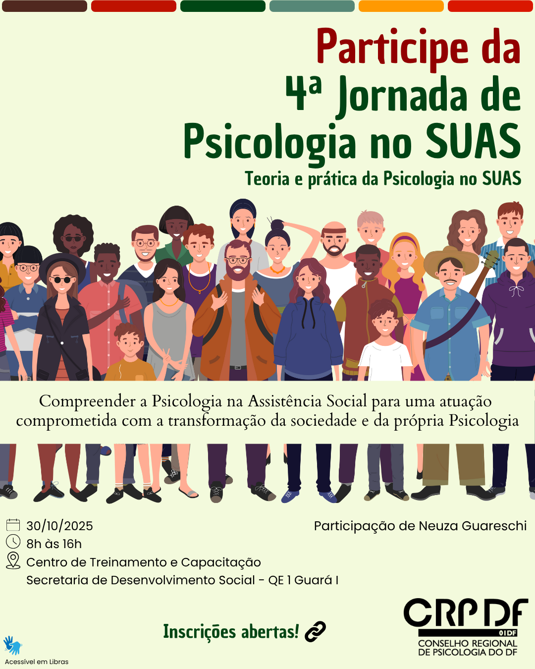 Participe da 4ª Jornada de Psicologia no SUAS: Teoria e prática da Psicologia no SUAS, uma realização do Conselho Regional de Psicologia do Distrito Federal (CRP 01/DF), que visa compreender a atuação da Psicologia na Assistência Social comprometida com a transformação da sociedade e da própria Psicologia.