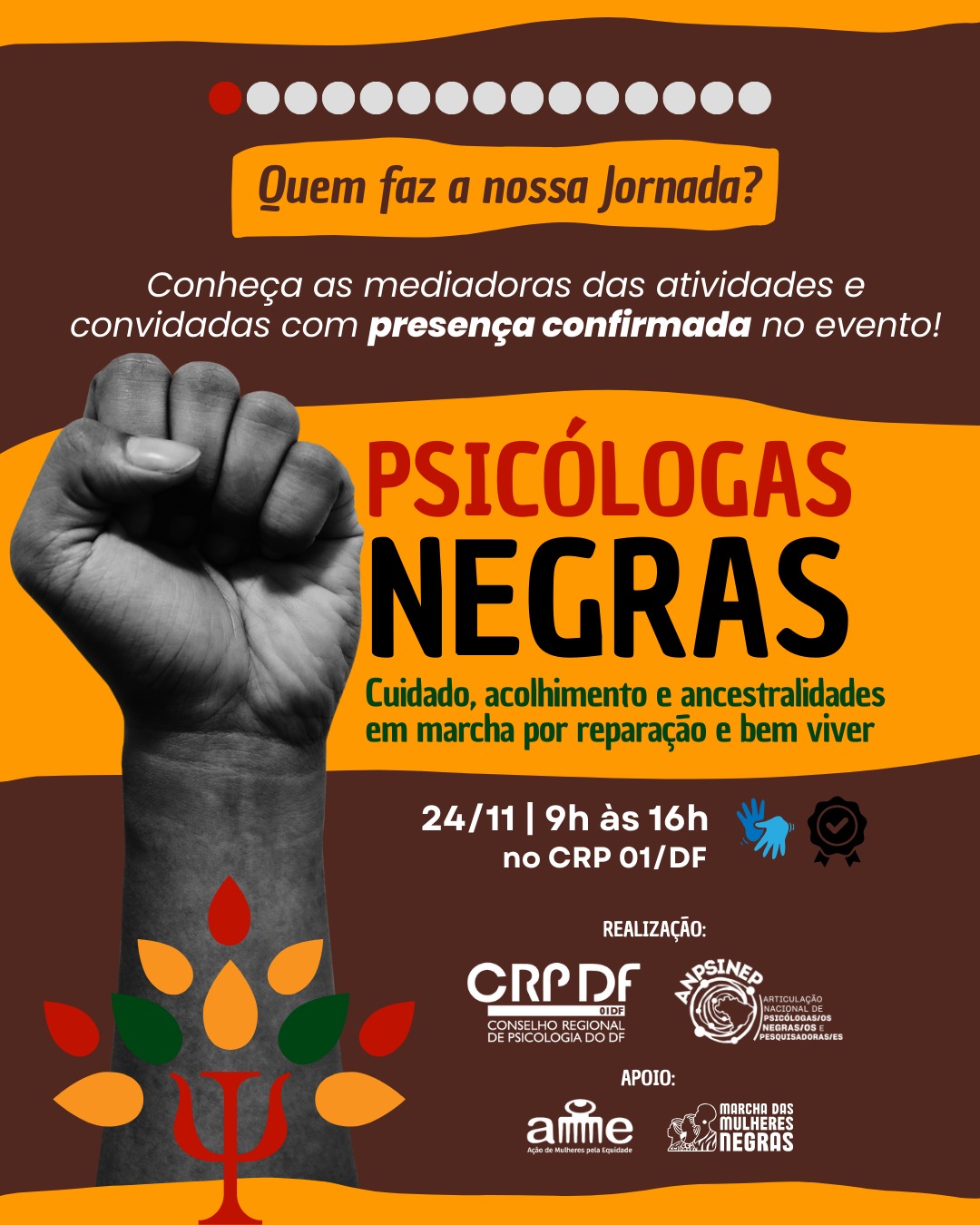 carrossel colorido com fotografias e apresentações de mediadoras e convidadas com presença confirmada na jornada “Psicólogas negras: cuidado, acolhimento e ancestralidades em marcha por reparação e bem viver”, que será realizada no CRP 01/DF no dia 24 de novembro, das 9h às 16h, como um dos eventos preparatórios para a Marcha das Mulheres Negras 2025. Aparecem ícones que remetem a certificação de participação e acessibilidade em Libras, além da ilustração de uma mão em punho, uma árvore estilizada com tronco que remete ao símbolo da Psicologia e marca gráfica das instituições realizadoras e apoiadoras da jornada.