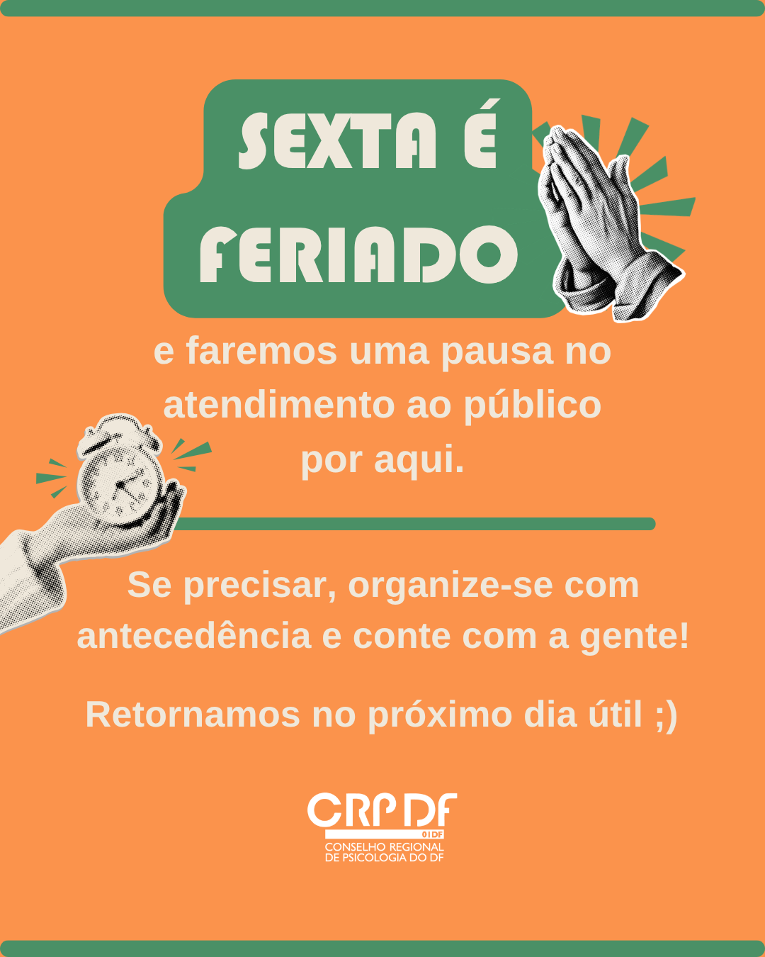 #descreviparavocê: imagem colorida destacando que não haverá atendimento ao público no CRP 01/DF no dia 3 de abril, em razão do feriado nacional da Paixão de Cristo. Aparecem ilustrações de duas mãos unidas e de uma mão segurando um relógio. Na parte inferior, está a marca gráfica do Conselho.