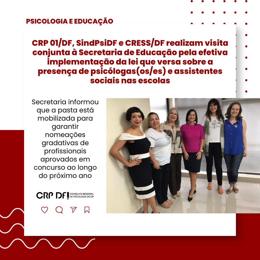 Em ação conjunta com o Sindicato das Psicólogas e Psicólogos do Distrito Federal (SindPsiDF) e Conselho Regional de Serviço Social do Distrito Federal (CRESS/DF), a Comissão Especial de Psicologia e Educação do CRP 01/DF foi recebida, na última quarta-feira (04) pela secretária de educação, Hélvia Paranaguá, para tratar da implementação da Lei nº 13.935/2019, que versa sobre a presença de psicólogas(os/es) e assistentes sociais nas escolas de educação básica.