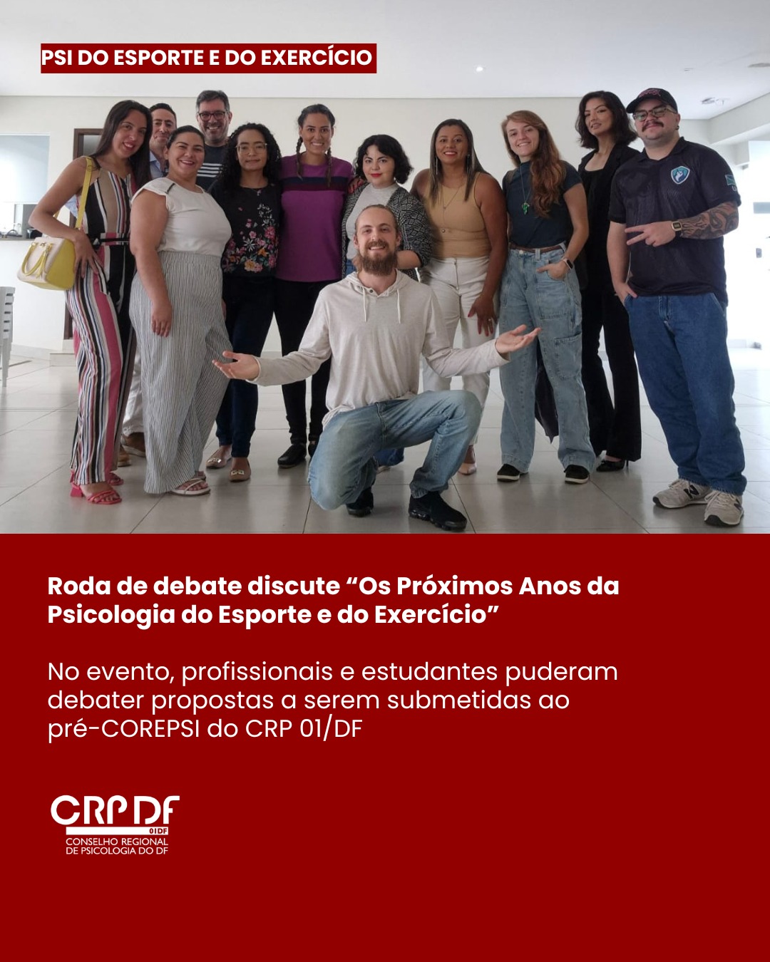 Na manhã do dia 19 de outubro, a Comissão Especial de Psicologia do Esporte e do Exercício do Conselho Regional de Psicologia do Distrito Federal promoveu um importante evento de mobilização para os pré-COREPSIS na área da Psicologia do Esporte e do Exercício, reunindo estudantes e profissionais para discutirem e elaborarem propostas que serão enviadas aos eventos que precedem o COREPSI DF, etapa regional do Congresso Nacional de Psicologia. O encontro foi uma oportunidade para abordar, de forma ampla, os desafios da saúde mental no contexto esportivo e no exercício físico, com ênfase nas questões que tangem o futuro dessa área de atuação.