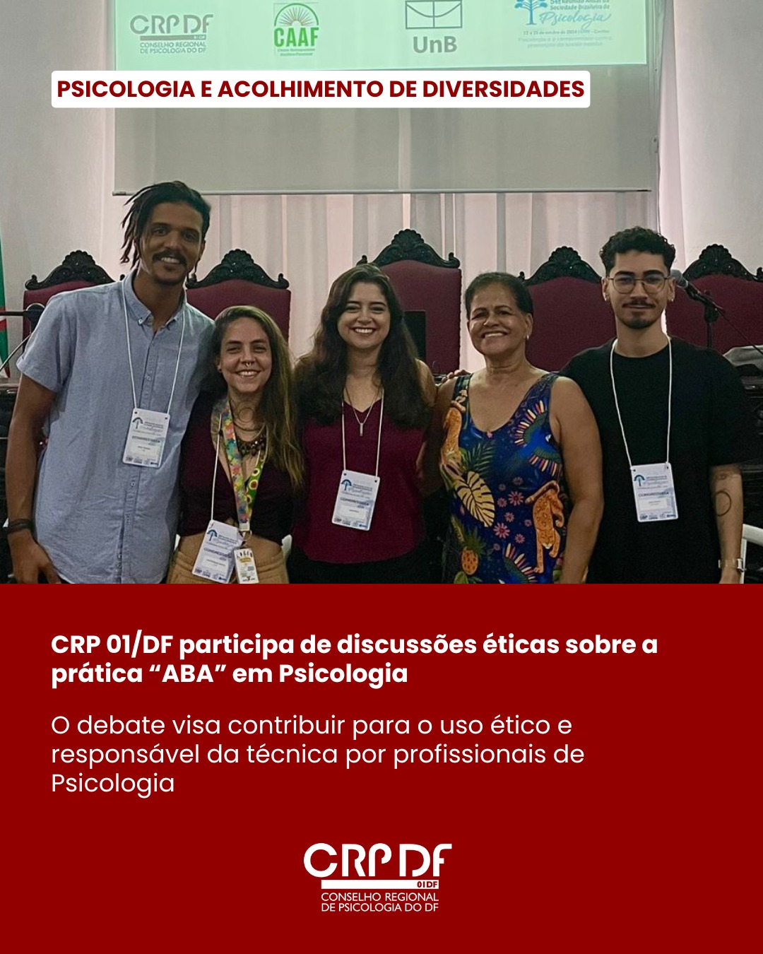 O Grupo de Trabalho “ABA”, fruto da Comissão de Orientação e Fiscalização, representou o Conselho Regional de Psicologia do Distrito Federal na 54ª Reunião Anual da Sociedade Brasileira de Psicologia, realizada em Curitiba, na Universidade Federal do Paraná, entre 22 a 25 de outubro de 2024, com o tema "Psicologia e o compromisso com a promoção da saúde mental".