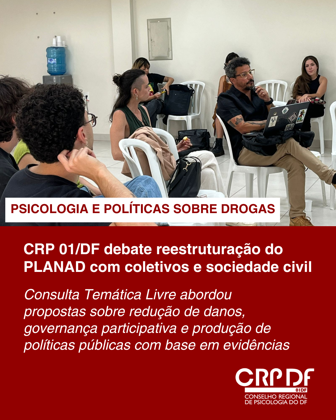Por fim, Thessa Guimarães, psicóloga conselheira do CRP 01/DF, ressalta: “É importante que o CRP 01/DF se mantenha articulado com movimentos e coletivos antiproibicionistas para promover encontros e consultas sobre a política de drogas do DF. A articulação entre sociedade civil e governo é fundamental para efetivar a atenção psicossocial em liberdade para a população.”