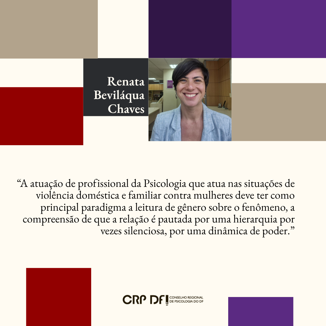 Renata Beviláqua Chaves é psicóloga, atua há 16 anos na prevenção e enfrentamento à violência contra as mulheres, é analista judiciária e coordenadora administrativa da Coordenadoria da Mulher do TJDFT, onde desenvolve ações de implementação da Lei Maria da Penha, formação de profissionais e produção de materiais técnicos sobre violência sexual e de gênero.