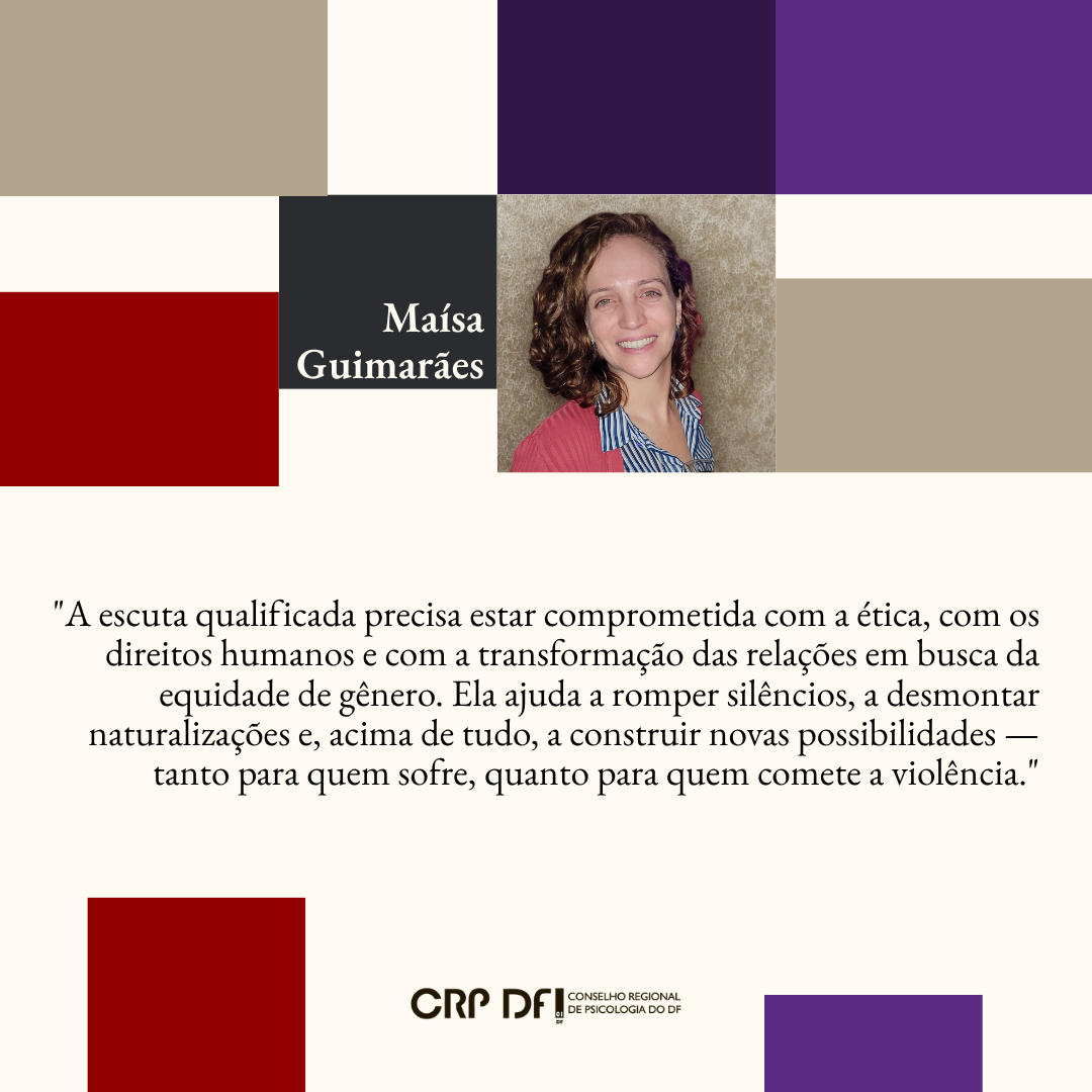Maísa Guimarães é psicóloga, doutora em Psicologia Clínica e Cultura (UnB), com trajetória voltada à formulação de políticas públicas de enfrentamento à violência contra as mulheres, servidora da Secretaria da Mulher do DF, onde atua no Espaço Acolher, programa que atende famílias e autores de violência doméstica.