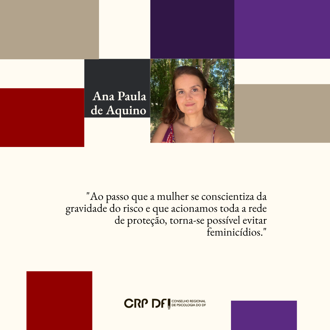 A psicóloga Ana Paula de Aquino é mestre em Psicologia Clínica (UnB), com especialização em Saúde Mental, formação em Psicanálise, vasta experiência no enfrentamento à violência de gênero e, atualmente, integra o “Programa Elas”, que oferece acolhimento psicológico a magistradas e servidoras vítimas de violência.