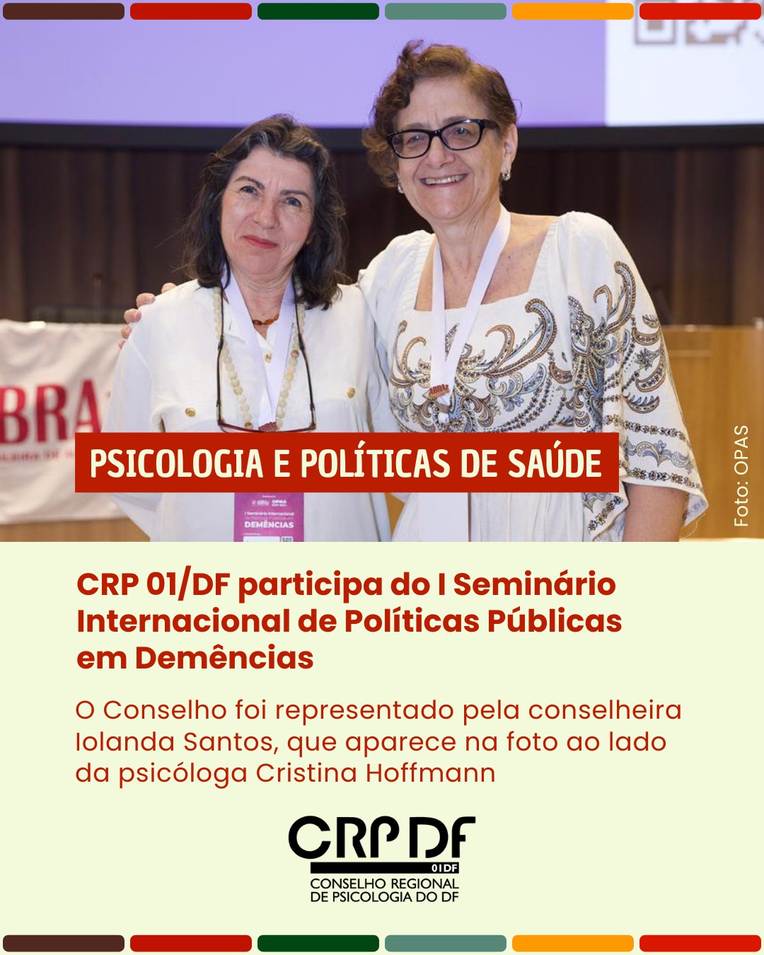 O CRP 01/DF foi representado pela conselheira efetiva Iolanda Bezerra dos Santos Brandão (que aparece na foto ao lado da psicóloga Cristina Hoffmann, referência em envelhecimento saudável). Ela participou das discussões sobre os desafios e avanços no enfrentamento das demências no Brasil e no mundo. “Foi possível acompanhar de perto os debates mais atuais sobre o cuidado e os direitos das pessoas com demência, bem como das pessoas encarregadas deste cuidado”, conta Iolanda, “ocasião propícia para absorver conhecimentos técnicos e científicos de referência internacional, além de identificar tendências e desafios para o fortalecimento das políticas públicas nessa área”, completa.