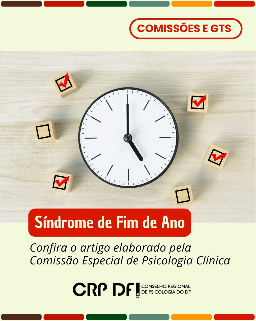 #descreviparavoce: card colorido contém uma imagem de um relógio e de várias marcações indicando tarefas realizadas e pendentes. Aparece uma chamada para leitura do artigo da Comissão Especial de Psicologia Clínica do CRP 01/DF, além da marca gráfica da autarquia.