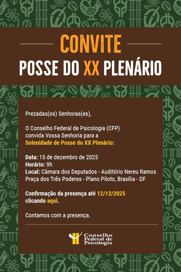#descreviparavocê: convite para a Solenidade de Posse do 20º Plenário do Conselho Federal de Psicologia (CFP), que será realizada no dia 15 de dezembro de 2025, às 9h, no Auditório Nereu Ramos da Câmara dos Deputados. É solicitada confirmação de presença pelo link disponível na legenda e bio, aparecendo também a marca gráfica do CFP na parte inferior da imagem.