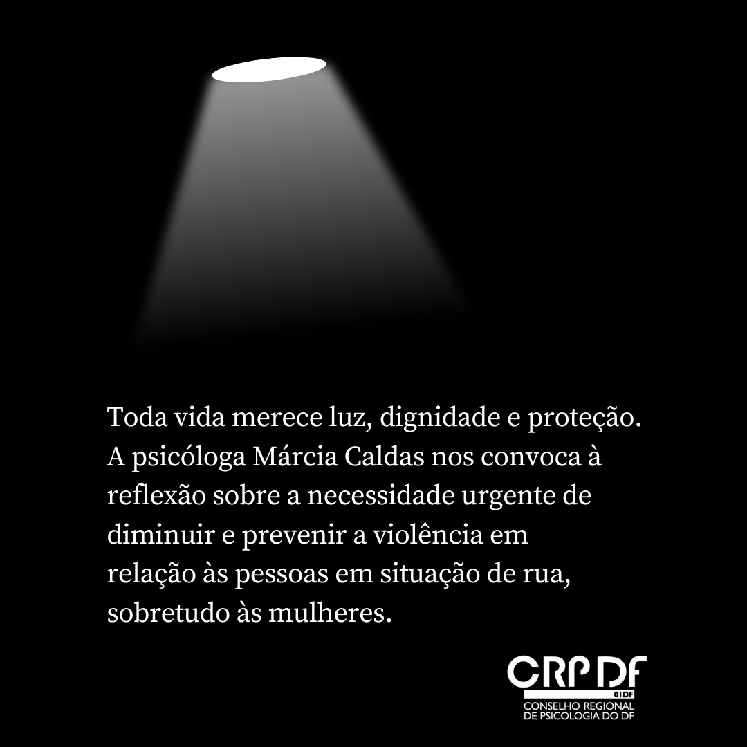 #DescreviParaVocê: imagem com fundo preto e fotografia de uma luminária direcionando um feixe de luz sobre texto em letras brancas que diz: Toda vida merece luz, dignidade e proteção. A psicóloga Márcia Caldas nos convoca à reflexão sobre a necessidade urgente de diminuir e prevenir a violência em relação às pessoas em situação de rua, sobretudo às mulheres. Na parte inferior da imagem, está a marca gráfica do CRP 01/DF.