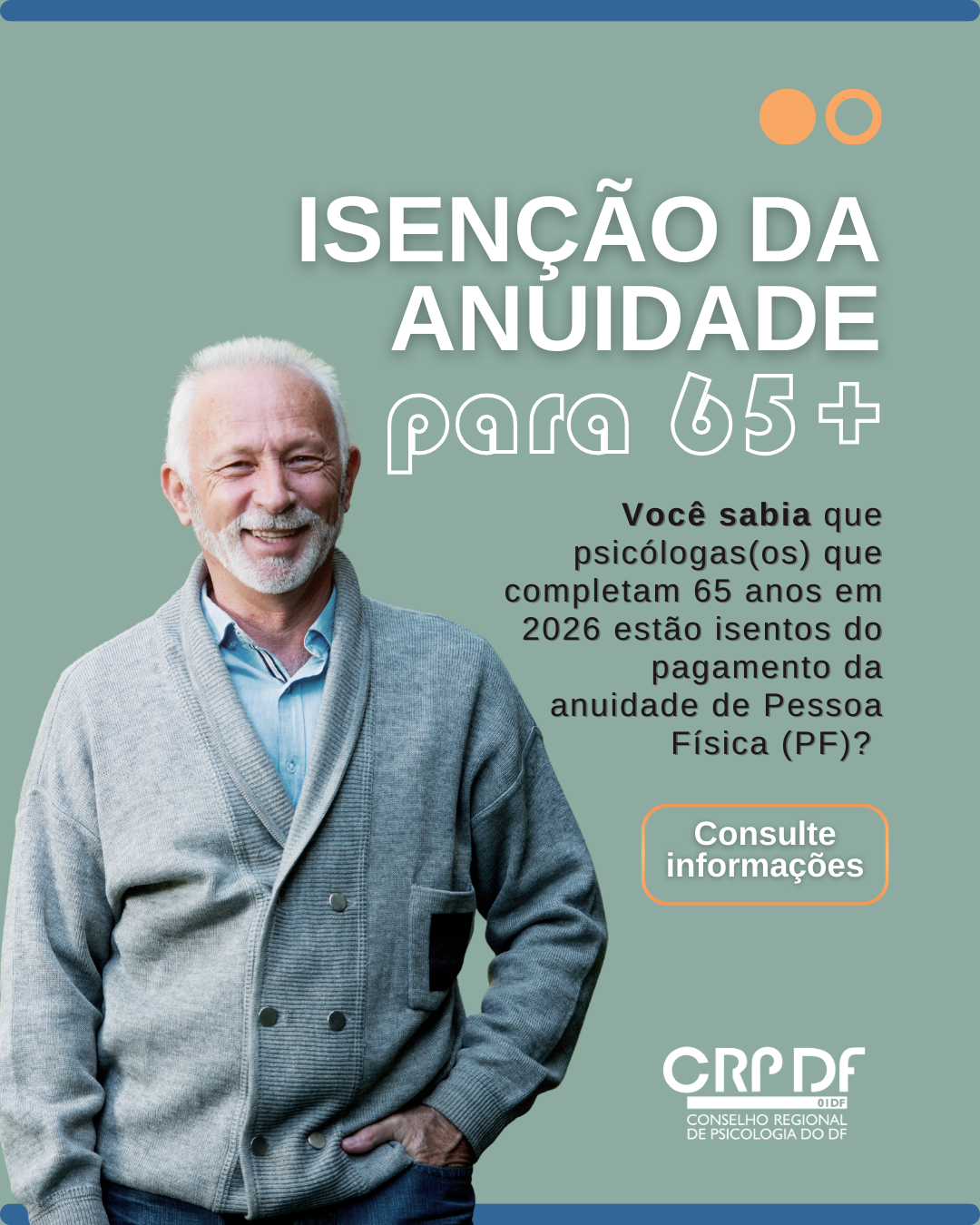 #descreviparavocê: imagem com fundo verde, margens azuis e detalhes na cor laranja. Em destaque, está a fotografia de um homem idoso branco com a informação textual: Isenção da anuidade para 65+. Você sabia que psicólogas(os) que completam 65 anos em 2026 estão isentos do pagamento da anuidade de Pessoa Física (PF)? Consulte informações. Na parte inferior, está a aplicação branca da marca gráfica do CRP 01/DF.