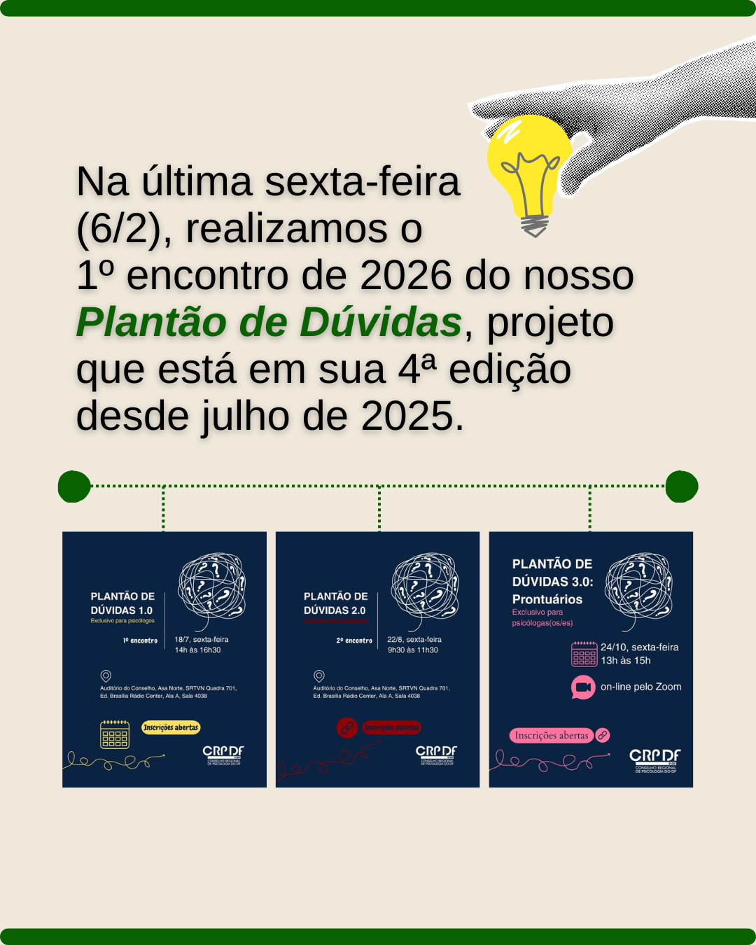 #descreviparavocê: carrossel composto por sete imagens que mostram os principais assuntos discutidos no primeiro encontro de 2026 do projeto Plantão de Dúvidas do CRP 01/DF. Aparece a ilustração de um balão de diálogo formado por pontos de interrogação e fios que vão se desenrolando e mãos indicando destaques nas imagens. Há um registro das pessoas presentes na última reunião on-line, que aparece na tela de um computador, além de ilustrações de uma bússola, um computador, um cadeado e um megafone saindo da tela de um laptop.