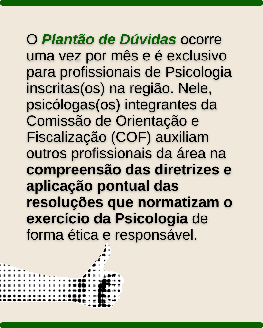 Você conhece o projeto Plantão de Dúvidas, idealizado pela conselheira presidenta da COF, Glícia Feitoza, e realizado todo mês pela Comissão de Orientação e Fiscalização (COF) do CRP 01/DF? Confira o que rolou no nosso último encontro e se você tem dúvidas sobre práticas éticas na Psicologia ou se encontra numa situação de conflito, fique atento às próximas edições do nosso Plantão!