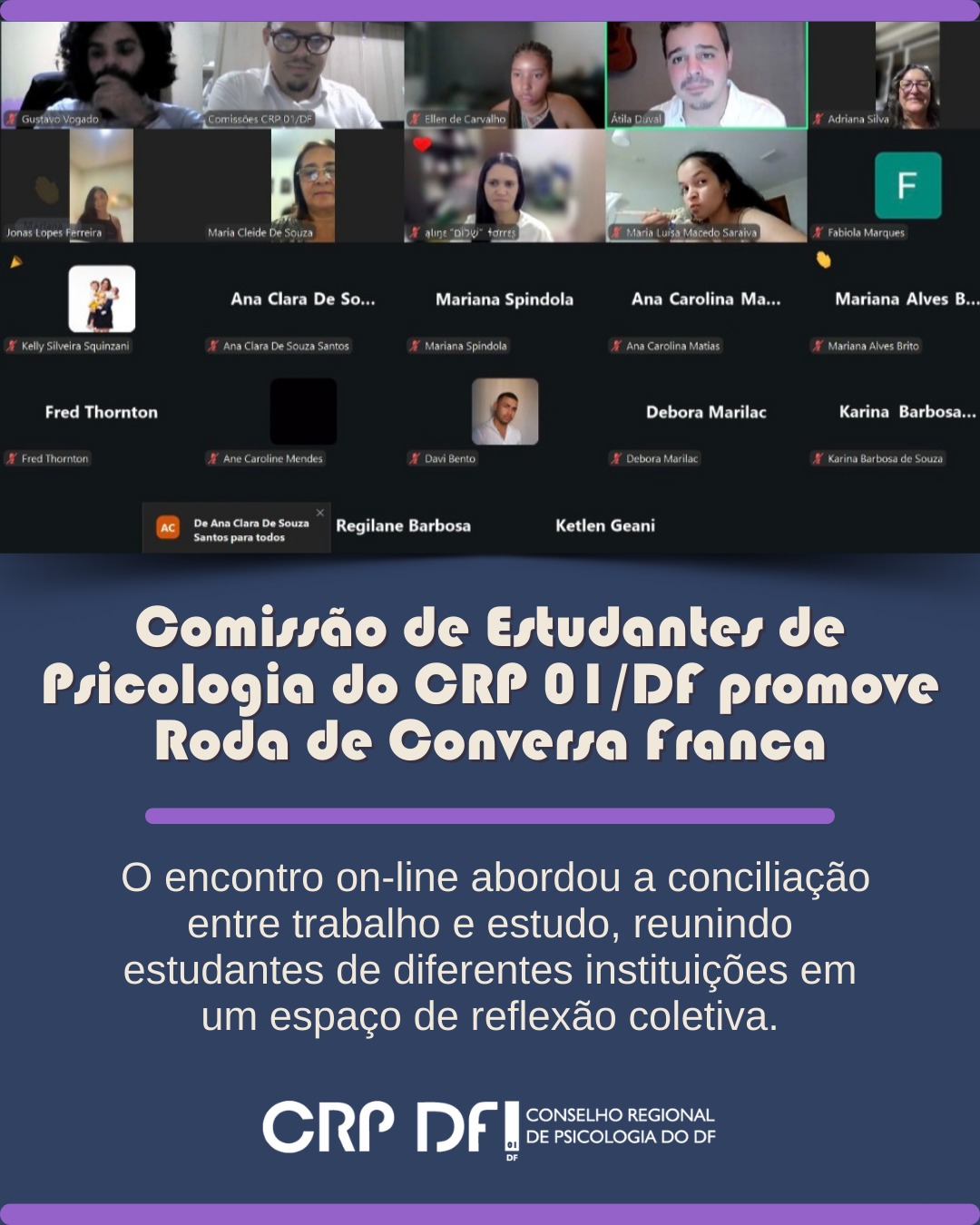 “A Comissão Especial de Estudantes de Psicologia do CRP 01/DF realizou, no dia 4 de março, a primeira Roda de Conversa Franca on-line sobre conciliação entre trabalho e estudo, reunindo estudantes de diferentes instituições e semestres em um importante espaço de escuta, troca de experiências e reflexão coletiva.