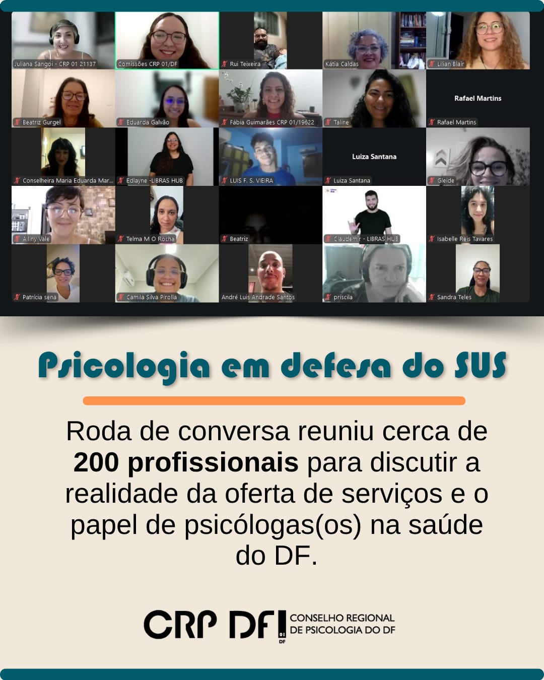 No dia 9 de abril, realizamos a roda de conversa on-line "Psicologia no SUS: quem somos e que saúde queremos construir?", um espaço de escuta, troca e reflexão sobre a realidade da saúde no Distrito Federal e sobre a nossa atuação enquanto profissionais de Psicologia nesse contexto.