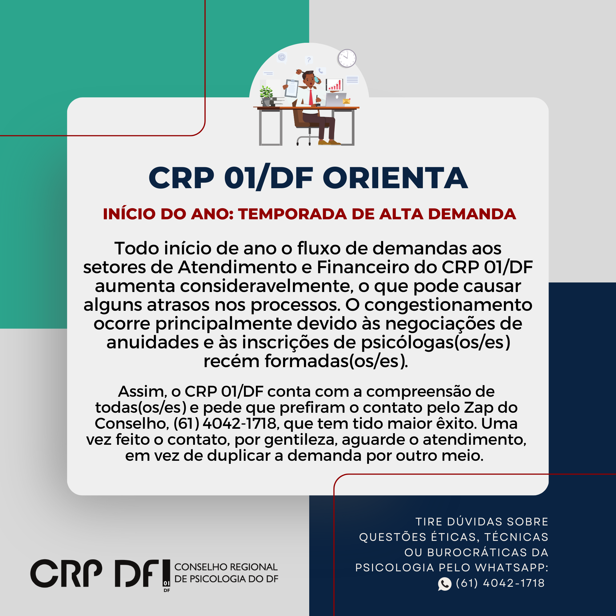 Assim, o CRP 01/DF conta com a compreensão de todas(os/es) e pede que prefiram o contato pelo Zap do Conselho, (61) 4042-1718, que tem tido maior êxito. Uma vez feito o contato, por gentileza, aguarde o atendimento, em vez de duplicar a demanda por outro meio.