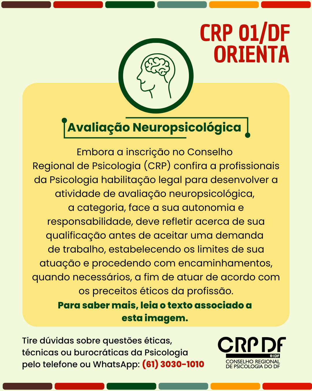#descreviparavocê: card colorido contendo uma barra no topo e uma na base compostas por seis retângulos coloridos, chamada CRP 01/DF ORIENTA em vermelho, retângulo amarelo com ilustração de uma cabeça com desenho de cérebro no topo do retângulo e o texto "Avalação Neuropsicológica - Embora a inscrição no Conselho Regional de Psicologia (CRP) confira a profissionais da Psicologia habilitação legal para desenvolver a atividade de avaliação neuropsicológica, a categoria, face a sua autonomia e responsabilidade, deve refletir acerca de sua qualificação antes de aceitar uma demanda de trabalho, estabelecendo os limites de sua atuação e procedendo com encaminhamentos quando necessários, a fim de atuar de acordo com os preceitos éticos da profissão. Para saber mais, leia o texto associado a esta imagem." em preto; e marca gráfica do CRP em preto na base direita do card.