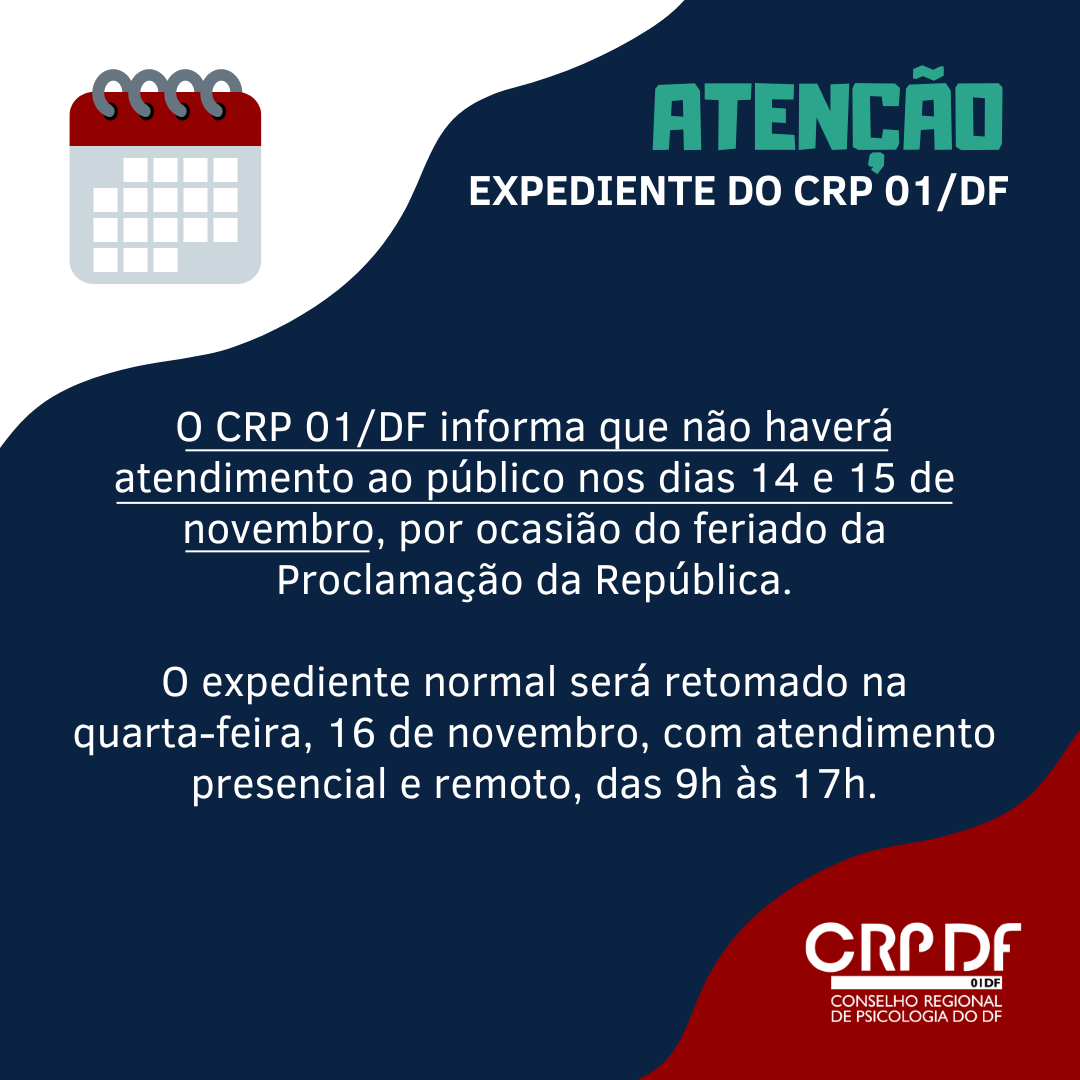 O CRP 01/DF informa que não haverá atendimento ao público nos dias 14 e 15 de novembro, por ocasião do feriado da Proclamação da República.