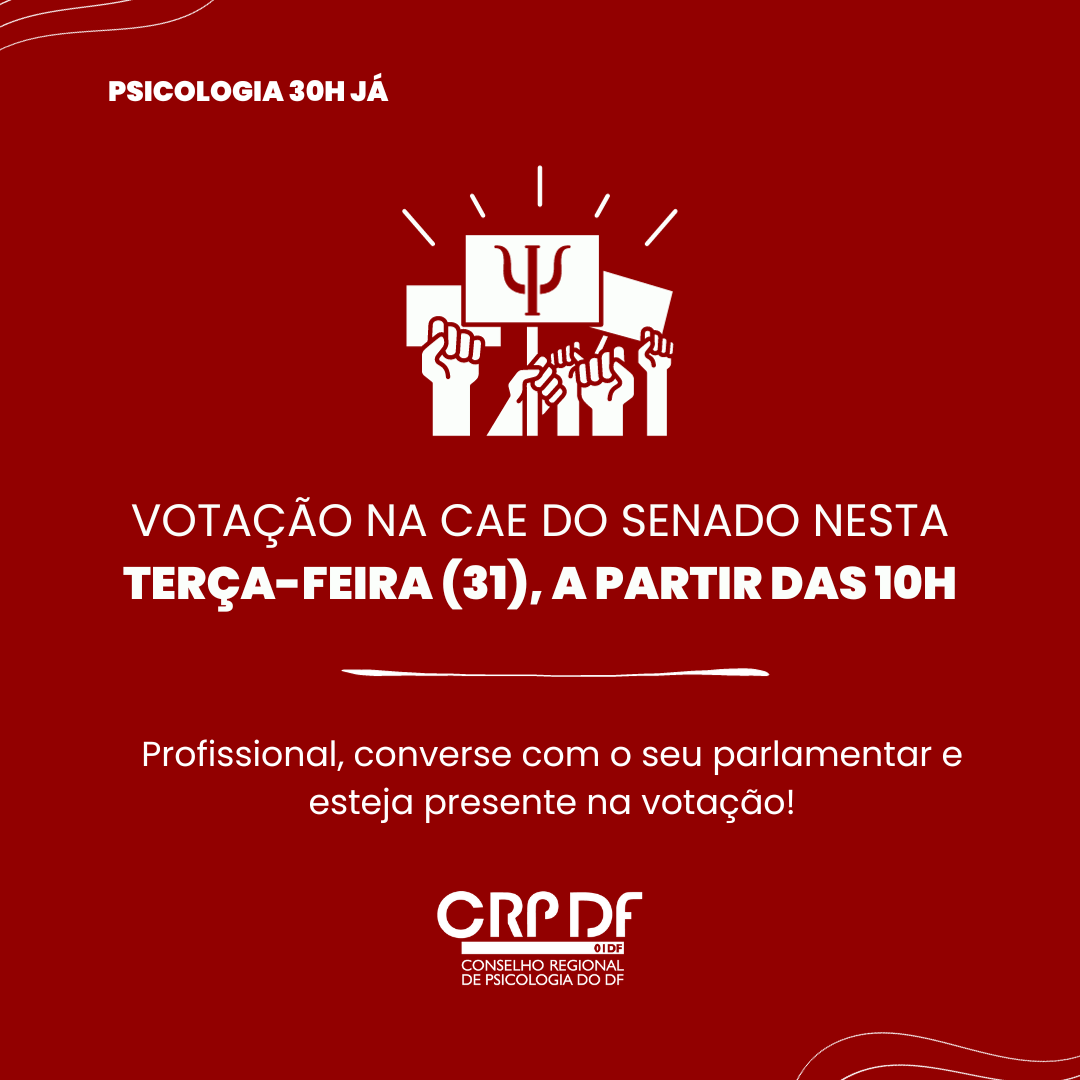 #DescreviParaVocê: card com fundo vermelho e uma chamada para participar da votação do PLS nº 511/2017 na Comissão de Assuntos Econômicos (CAE) do Senado Federal nesta terça-feira (31), às 10h. Há uma ilustração de mãos segurando cartazes com o símbolo da Psicologia e a marca gráfica do CRP 01/DF.