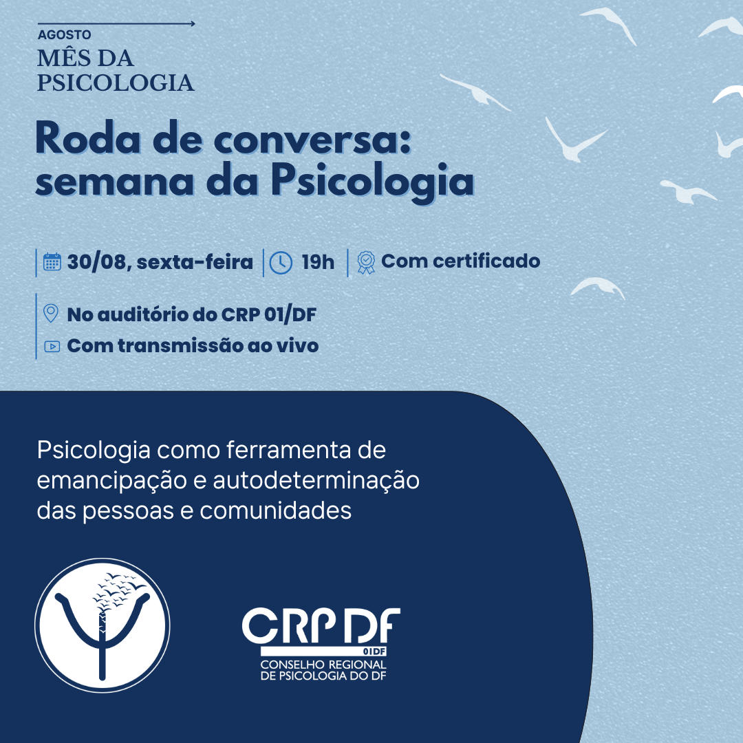 Dia 30 de agosto, sexta-feira, às 19h, presencialmente no auditório do CRP 01/DF(SRTVN Quadra 701 - Ed. Brasília Rádio Center - Ala A - 4º andar - Sala 4024 Asa Norte - Brasília-DF)