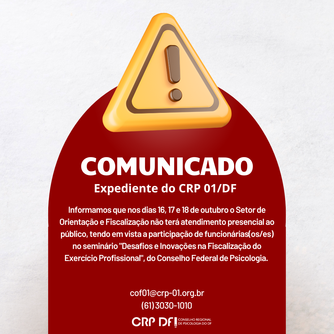 Informamos que nos dias 16, 17 e 18 de outubro o Setor de Orientação e Fiscalização não terá atendimento presencial ao público, tendo em vista a participação de funcionárias(os/es) no seminário "Desafios e Inovações na Fiscalização do Exercício Profissional", do Conselho Federal de Psicologia.