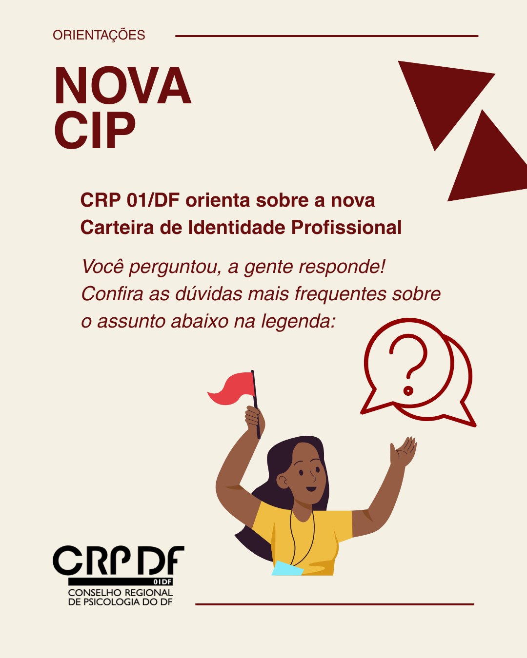 #DescreviParaVocê: card com elementos gráficos da cor vermelha, com uma ilustração de uma mulher segurando uma bandeira e fazendo um gesto de orientação abaixo do texto que chama para ler a legenda e esclarecer as dúvidas sobre a nova Carteira de Identidade Profissional (CIP), e a marca gráfica do CRP 01/DF no canto inferior direito.