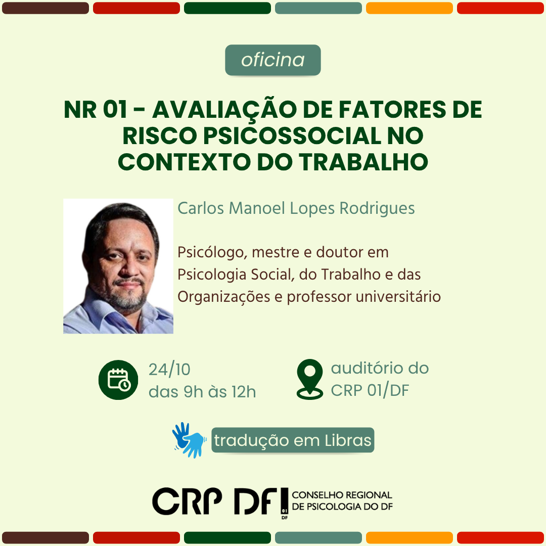 Participe da oficina “NR 01 - Avaliação de fatores de risco psicossocial no contexto do trabalho”, uma realização da Comissão Especial de Avaliação Psicológica e da Comissão Especial de Psicologia Organizacional e do Trabalho do CRP 01/DF do Conselho Regional de Psicologia do Distrito Federal (CRP 01/DF).
