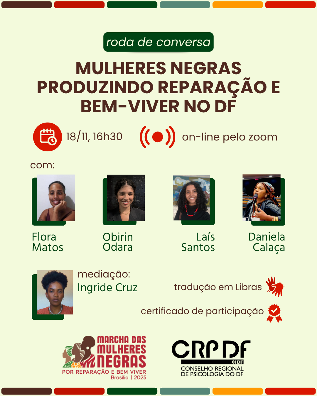 - Ingride Aparecida Pereira da Cruz (CRP 01/21295): Psicologia Clínica Afrocentrada, pela Terapia Cognitivo-Comportamental e especialista em Avaliação Psicológica, palestrante, integrante da Comissão de raça e povos indígenas e tradicionais e da Comissão de Ética. Conselheira do 18º Plenário do CRP 01/DF. Pesquisadora em temáticas de raça, cultura, aquilombamento, território, gênero, colonialidade e branquitude.