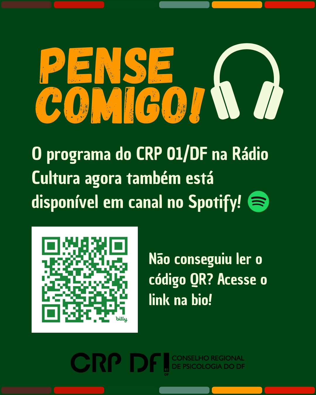 O “Pense Comigo”, programa de rádio do Conselho Regional de Psicologia do Distrito Federal (CRP 01/DF) em parceria com a Rádio Cultura FM de Brasília, agora também está disponível no Spotify! Os episódios são publicados após irem ao ar na rádio — o que ocorre às terças e quintas, por volta das 13h, com reprise às 18h. A cada semana teremos um tema relacionado à Psicologia, saúde mental e políticas públicas.