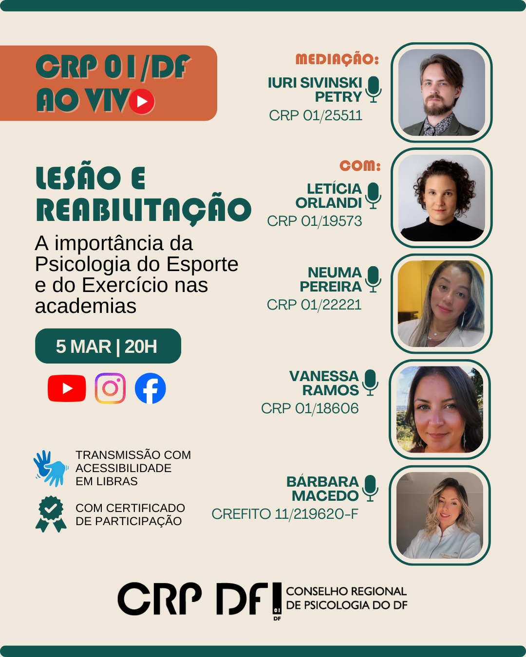 #descreviparavocê: imagem colorida com fotografias do mediador e das convidadas da live Lesão e reabilitação: a importância da Psicologia do Esporte e do Exercício nas academias, que será realizada no dia 5 de março de 2026, às 20h, pelas redes sociais do CRP 01/DF. Além de parte das informações que constam no texto que acompanha a imagem, aparece um destaque para o projeto CRP 01/DF ao vivo e a marca gráfica do Conselho.
