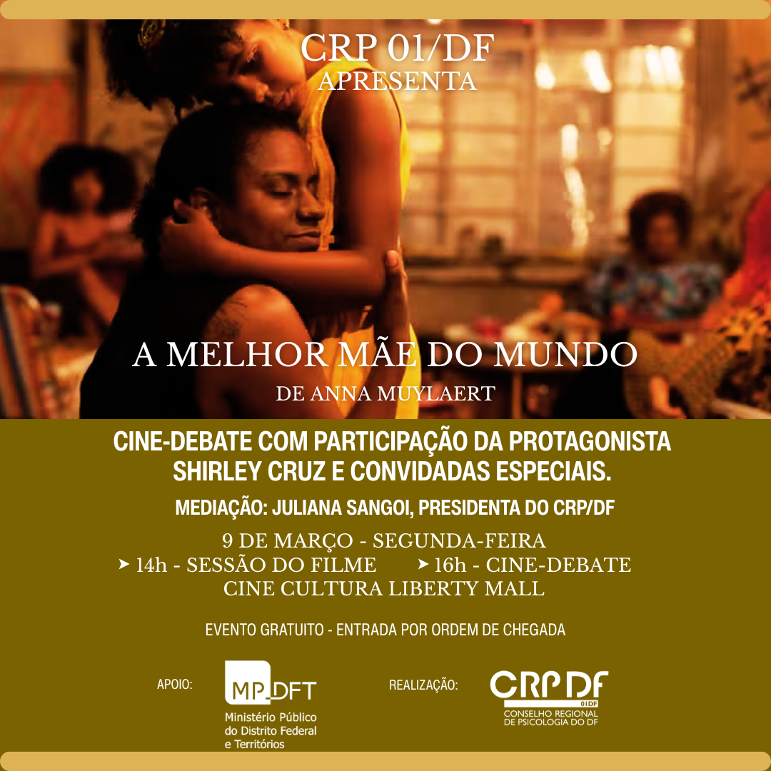 No dia 9 de março, o CRP 01/DF e o MPDFT convidam você para uma experiência que une cinema, psicologia e reflexão social. Vamos realizar o Cine-Debate do filme "A Melhor Mãe do Mundo" , de Anna Muylaert, apresentado na Berlinale 2025. O evento contará com a participação presencial da atriz principal Shirley Cruz, que irá debater assuntos sociais trazidos pelo longa-metragem logo depois da exibição, que ocorre no cinema do Liberty Mall.