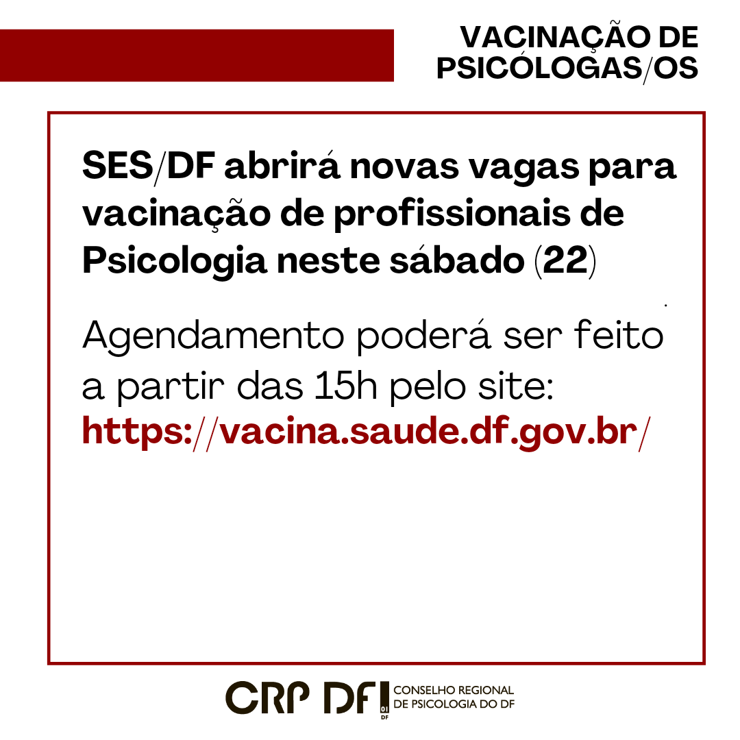 O Conselho Regional de Psicologia do Distrito Federal (CRP 01/DF) informa que, a partir das 15h de sábado (22 de maio), serão abertas mais de 15 mil novas vagas para agendamento da vacinação contra a Covid-19, destinada a profissionais de saúde, incluindo psicólogas e psicólogos regularmente inscritos e ativos na região.