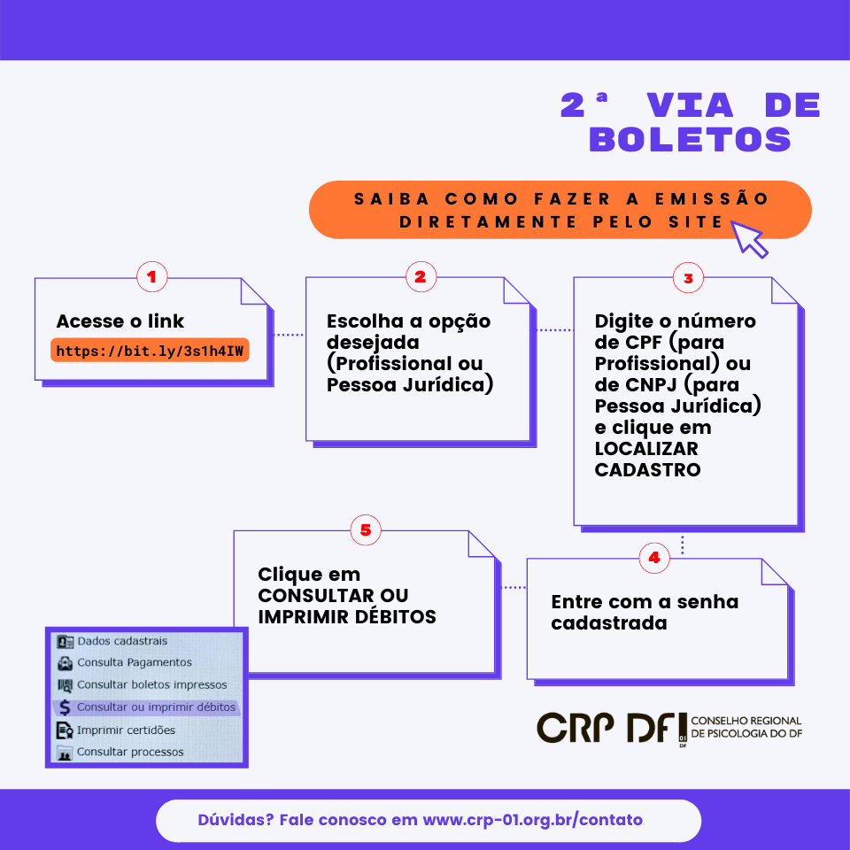 #DescreviParaVocê: além do conteúdo textual, o card possui um fundo branco e detalhes nas cores azul, preto, laranja e vermelho. Aparece um infográfico com o passo a passo para emissão da 2ª via de boletos junto ao CRP 01/DF e a marca gráfica do conselho.