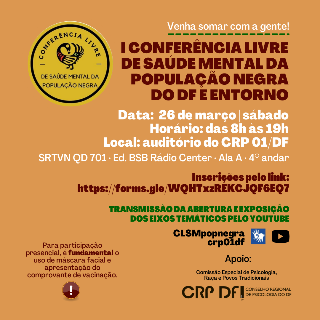 A conferência será presencial e contará com transmissão parcial pelo YouTube (https://www.youtube.com/channel/UCTtstv9SE4SwJCdY5nS02oA e https://www.youtube.com/crp01df), com acessibilidade em Libras.