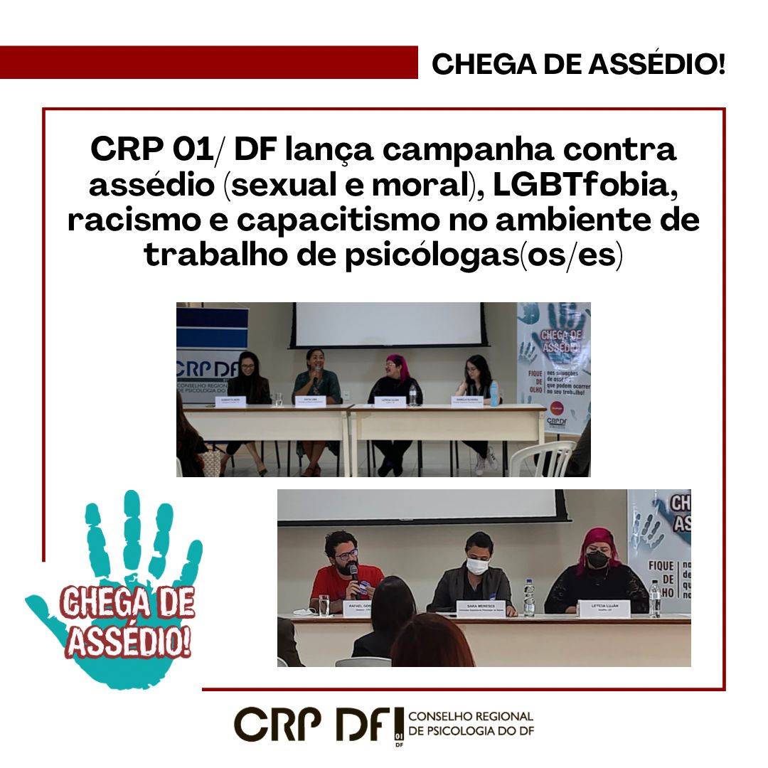 #DescreviParaVocê: a imagem colorida conta com a retranca “Chega de assédio!”, o título “CRP 01/ DF lança campanha contra assédio (sexual e moral), LGBTfobia, racismo e capacitismo no ambiente de trabalho de psicólogas(os/es)” e duas fotografias do evento onde se vê as mesas de abertura e temática, além das logomarcas da campanha e do CRP 01/DF.