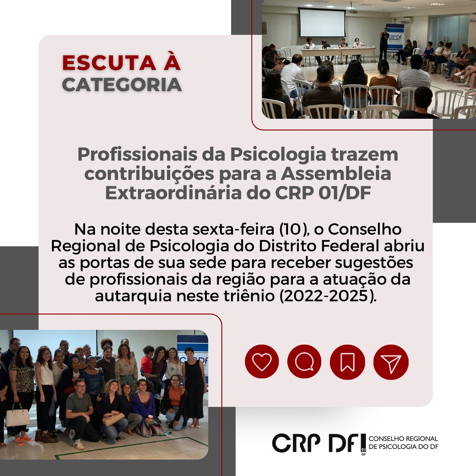 | ESCUTA À CATEGORIA | Profissionais da Psicologia trazem contribuições para a Assembleia Extraordinária do CRP 01/DF Na noite desta sexta-feira (10), o Conselho Regional de Psicologia do Distrito Federal abriu as portas de sua sede para receber sugestões de profissionais da região para a atuação da autarquia neste triênio (2022-2025). Todes profissionais presentes tiveram a oportunidade de tirar dúvidas, trocar experiências e criticar a atuação do Plenário.