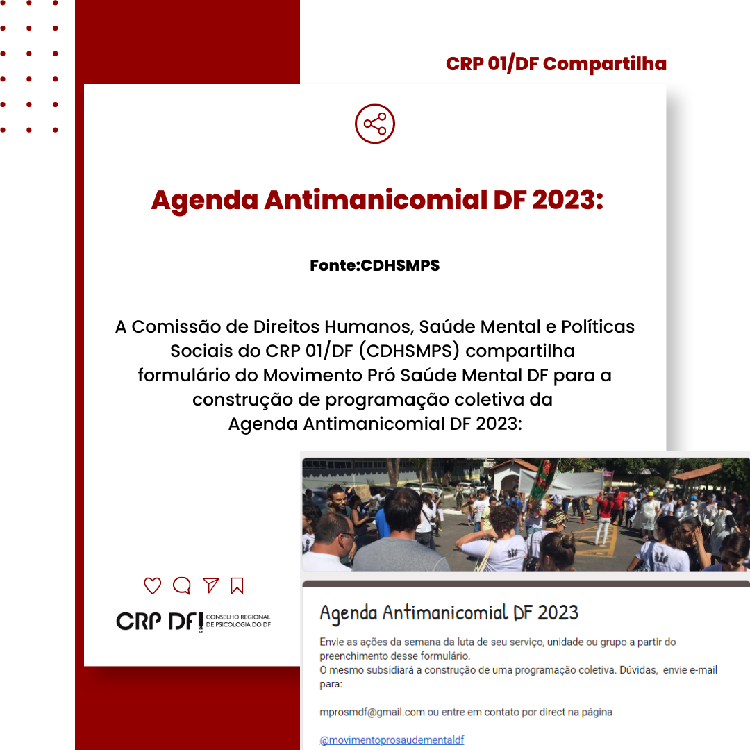 A Comissão de Direitos Humanos, Saúde Mental e Políticas Sociais do CRP 01/DF (CDHSMPS) compartilha formulário do Movimento Pró Saúde Mental DF para a construção de programação coletiva da Agenda Maio Antimanicomial DF 2023