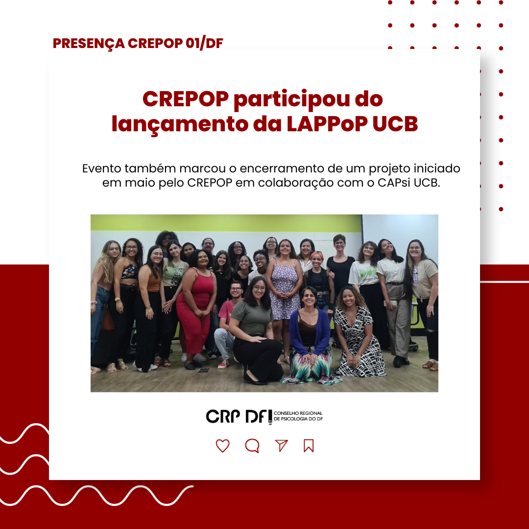 O Centro de Referências Técnicas em Psicologia e Políticas Públicas do Conselho Regional de Psicologia 01/DF (Crepop) participou do lançamento da Liga Acadêmica de Psicologia e Políticas Públicas da Universidade Católica de Brasília - LAPPoP UCB, em 4 de setembro. Este evento também marcou o encerramento de um projeto iniciado em maio pelo Crepop em colaboração com o CAPsi UCB, que abordou as Referências Técnicas de CAPS e de CRAS.
