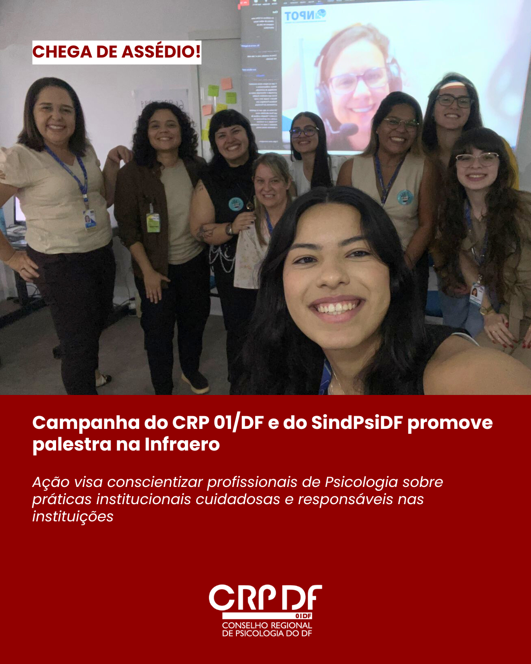 O Conselho Regional de Psicologia do Distrito Federal (CRP 01/DF), em parceria com o Sindicato de Psicologia do Distrito Federal (SindPsiDF), promoveu no dia 9 de outubro mais uma ação conjunta pela campanha "Chega de Assédio!", desta vez, no Núcleo de Psicologia Organizacional e do Trabalho da Infraero. A palestra foi ministrada pelas psicólogas Sara Meneses e Letícia Luján, que representam as respectivas instituições no Grupo de Trabalho que gere a campanha. O evento teve como objetivo conscientizar as(os) profissionais de Psicologia presentes sobre diferentes formas de assédio e fornecer ferramentas para combater essas práticas.