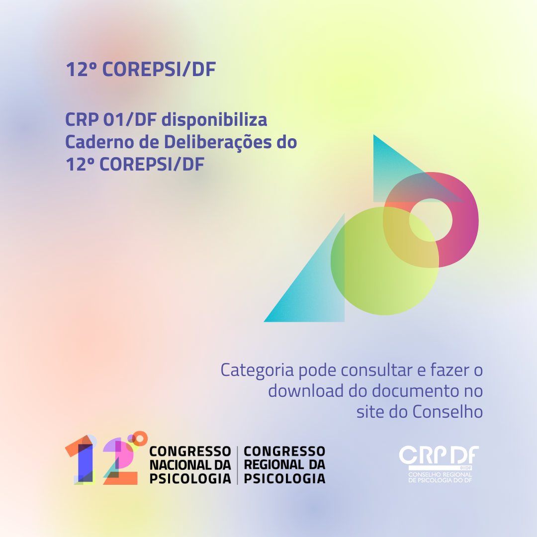 Está disponível no site do Conselho Regional de Psicologia do Distrito Federal (CRP 01/DF) o Caderno de Deliberações com as propostas aprovadas no 12º Congresso Regional da Psicologia do Distrito Federal (COREPSI/DF).