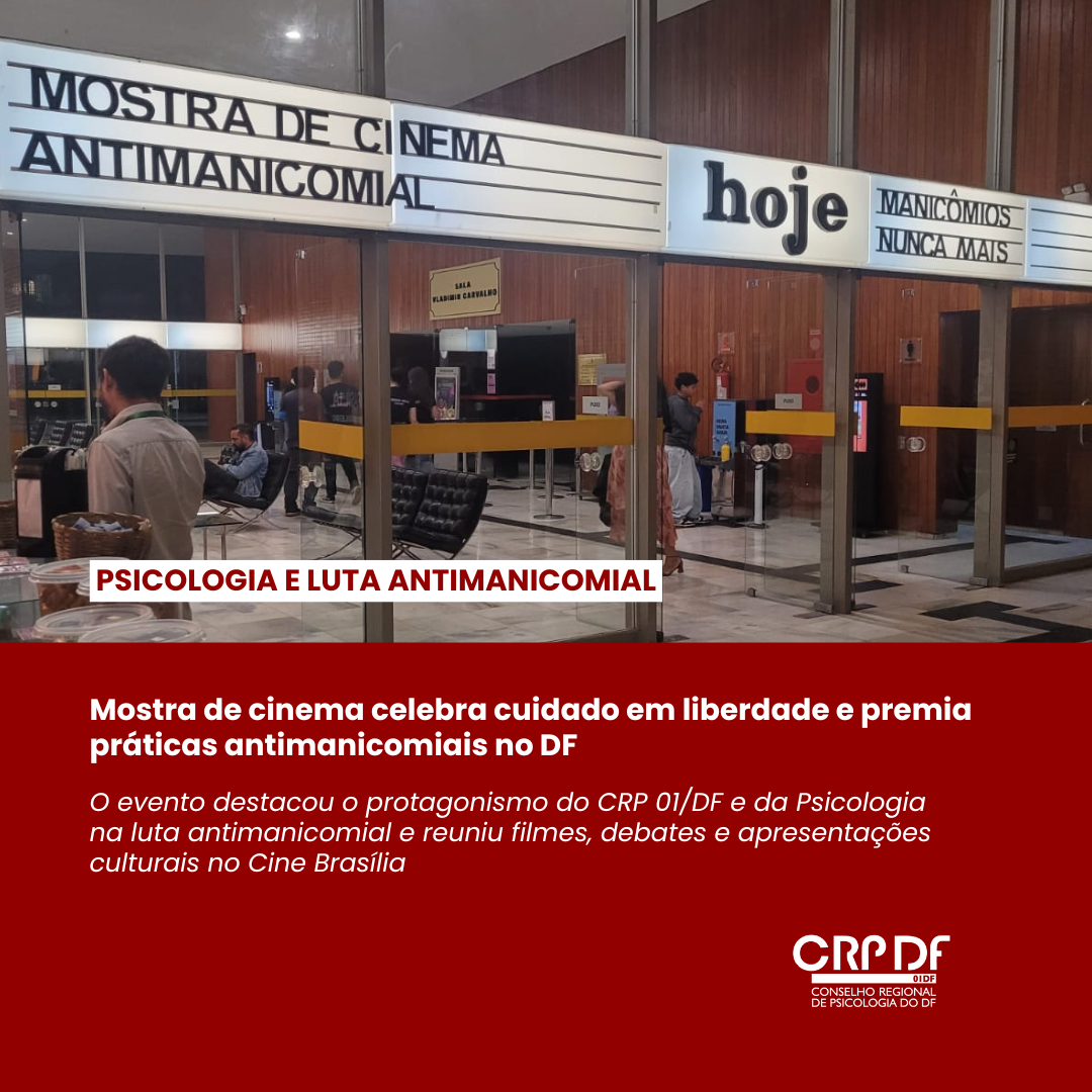 Entre os dias 16 e 18 de maio, o Cine Brasília foi palco da 1ª Mostra de Cinema Antimanicomial do Distrito Federal — Mostra Raquel França —, iniciativa do Fórum Antimanicomial do DF em parceria com o Conselho Regional de Psicologia do DF, sob a coordenação do psicólogo Luiz Alberto de Souza Junior e da artista plástica Yasmin Adorno. O evento integrou arte, política e saúde mental em uma programação diversa, com sessões de cinema, rodas de conversa, plenária e intervenções culturais, com o objetivo de celebrar a luta pelo cuidado em liberdade e reafirmar a importância de uma sociedade sem manicômios.