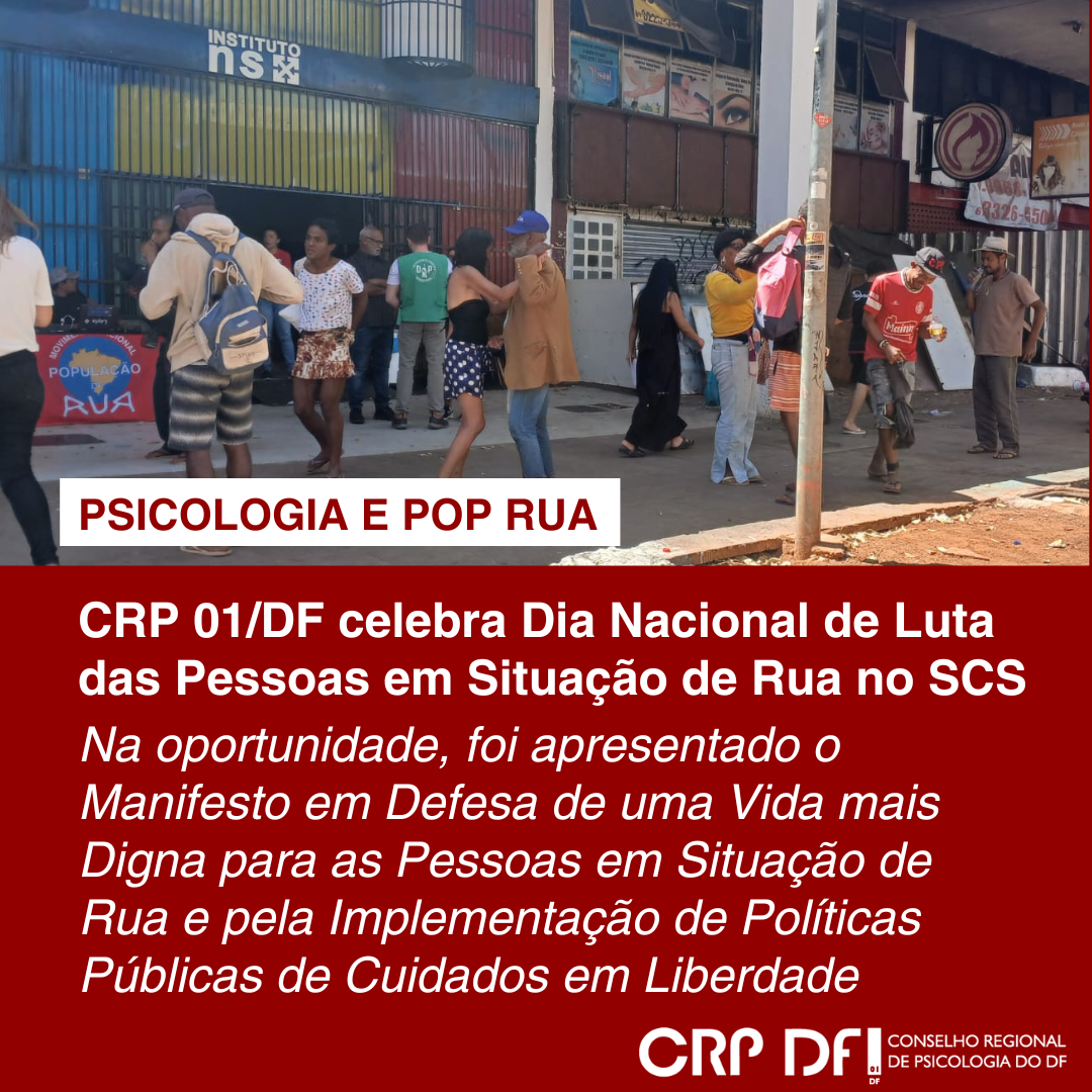 Nesta terça-feira (19), o Conselho Regional de Psicologia do Distrito Federal participou da celebração do primeiro Dia Nacional de Luta das Pessoas em Situação de Rua reconhecido pela lei. Em homenagem à data, o Movimento Nacional População de Rua (MNPR) realizou evento no Setor Comercial Sul (SCS) com apoio dos coletivos Café com Escuta e No Setor. O ato se preocupou em suprir diversas demandas da população em situação de rua, desde fornecimento de comida e roupas, até a promoção da cultura, com música e escuta de moradoras(es) do local.