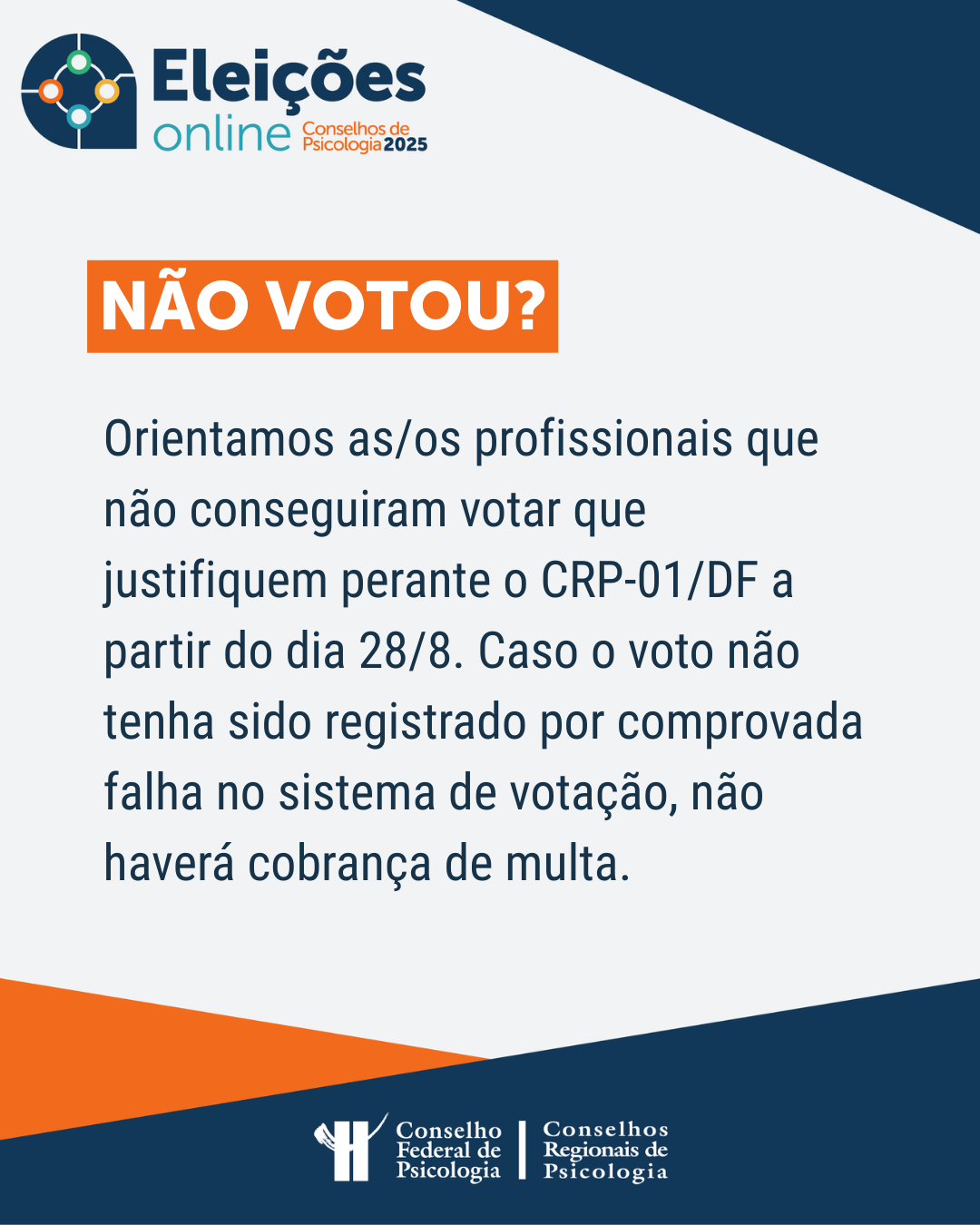 Orientamos as/os profissionais que não conseguiram votar que justifiquem perante o CRP-01/DF a partir do dia 28/8. Caso o voto não tenha sido registrado por comprovada falha no sistema de votação, não haverá cobrança de multa.