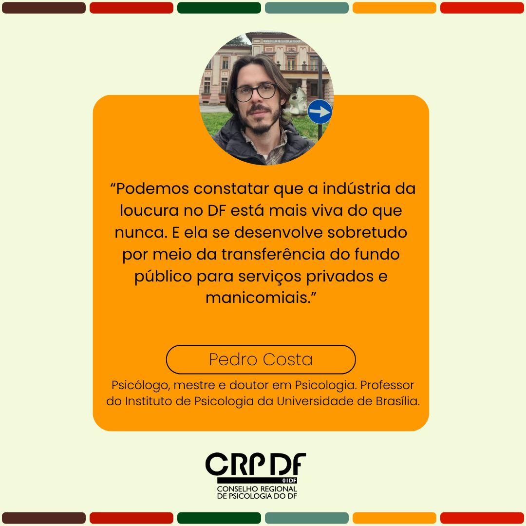 Já no texto elaborado pelo professor Pedro Costa, da Universidade de Brasília (UnB), o psicólogo traz dados do que chama de “indústria da loucura” no Distrito Federal, com recursos públicos financiando equipamentos privados e manicomiais.