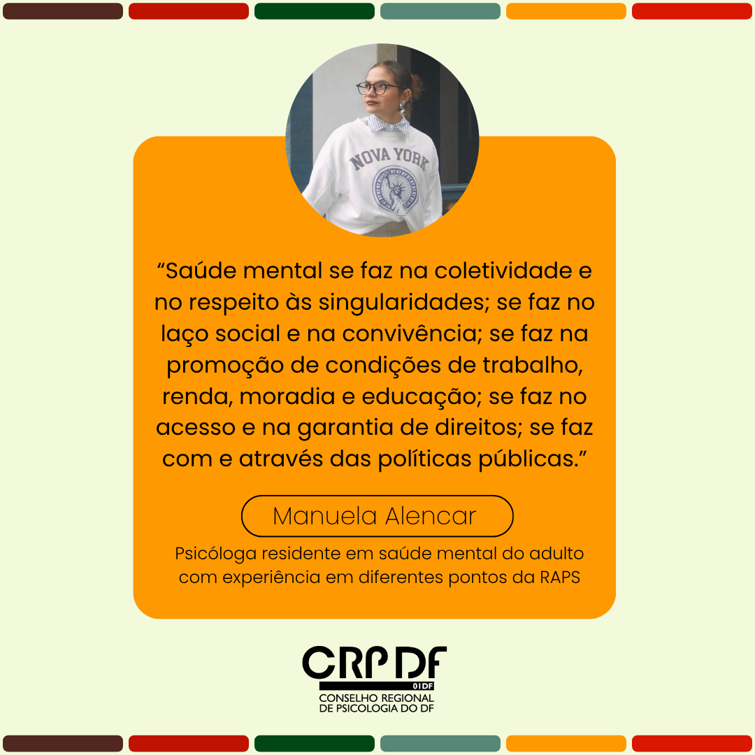 *Manuela Alencar é psicóloga formada pela Universidade Católica de Brasília (UCB), com percurso de pesquisa em Saúde Mental e Trabalho. Atualmente, é residente do Programa de Residência Multiprofissional em Saúde Mental do Adulto da Escola de Saúde Pública do Distrito Federal (ESP/DF), com experiência em diferentes pontos da Rede de Atenção Psicossocial (RAPS), como CAPS AD e CAPS Geral, Atenção Primária e Urgência e Emergência (SAMU/DF). Realiza pesquisa com ênfase em Saúde Mental, População em Situação de Rua e Políticas Públicas.