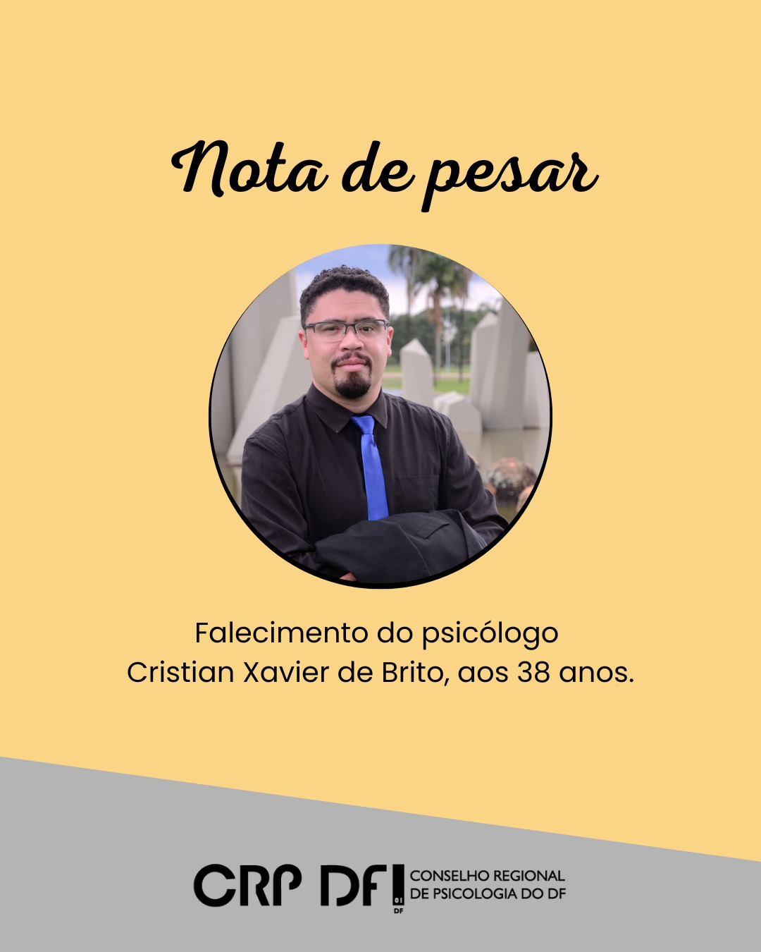 O Conselho Regional de Psicologia do Distrito Federal lamenta o falecimento do psicólogo Cristian Xavier de Brito, que tinha 38 anos e atuava na área clínica.