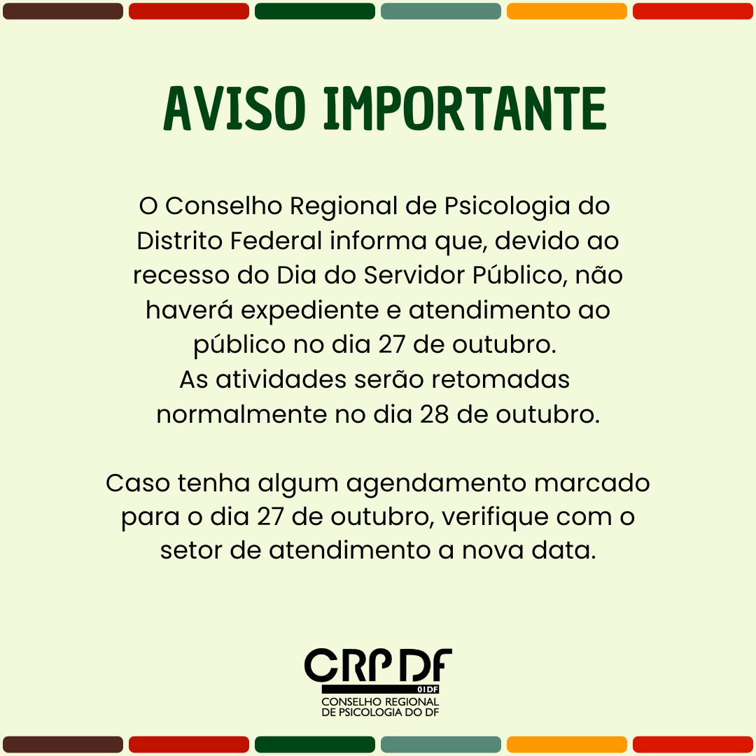 Devido ao recesso do dia Servidor Público, o CRP 01/DF não terá expediente e atendimento ao público na segunda-feira, 27/10. As atividades do Conselho serão retomadas no dia 28/10. O atendimento ao público é feito das 9h às 17h. O WhatsApp do Conselho é (61) 3030-1010.