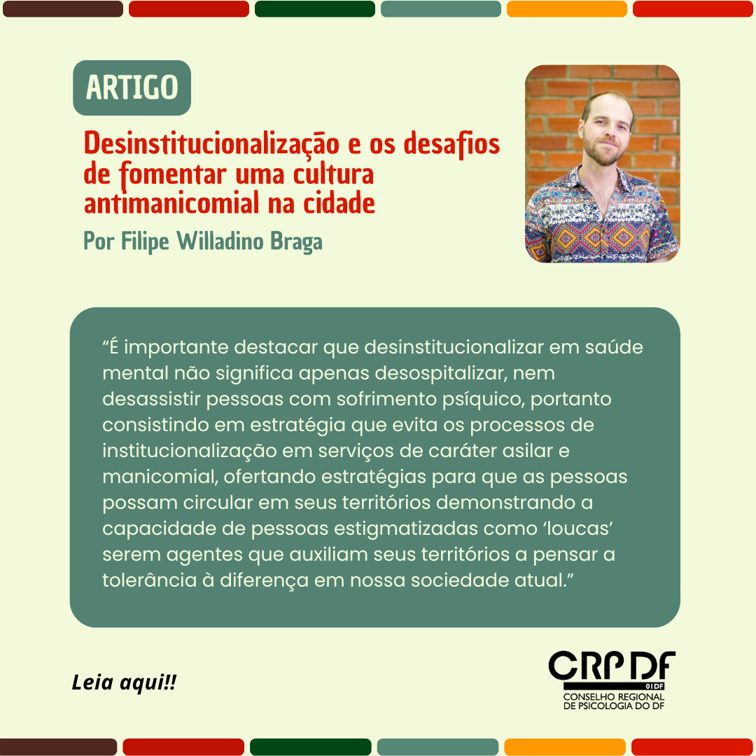 #DescriçãoDaImagem: card colorido com a fotografia do autor e chamada para leitura do artigo do psicólogo Filipe Willadino Braga. Aparece ainda um trecho do texto e a marca gráfica do CRP 01/DF.